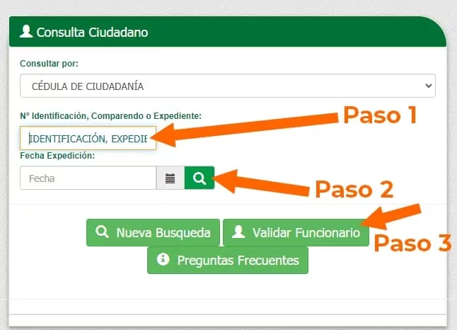 2. Seleccionar el archivo de identidad e ingresar número y fecha de expedición de la cédula o archivo de la persona que se quiere consultar